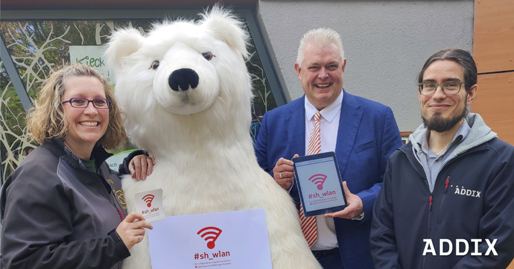 Im Tierpark Neumünster e.V. können sich Besucherinnen und Besucher nun kostenlos in das #sh_wlan einloggen. Zur Inbetriebnahme trafen sich Zoodirektorin Verena Kaspari, Vorstandsvertreter der Sparkasse Südholstein Ansgar Menke und Kilian Härtel (ADDIX). Das öffentliche WLAN wurde von ADDIX im Eingangsbereich sowie in den Gastronomie-Bereichen installiert.